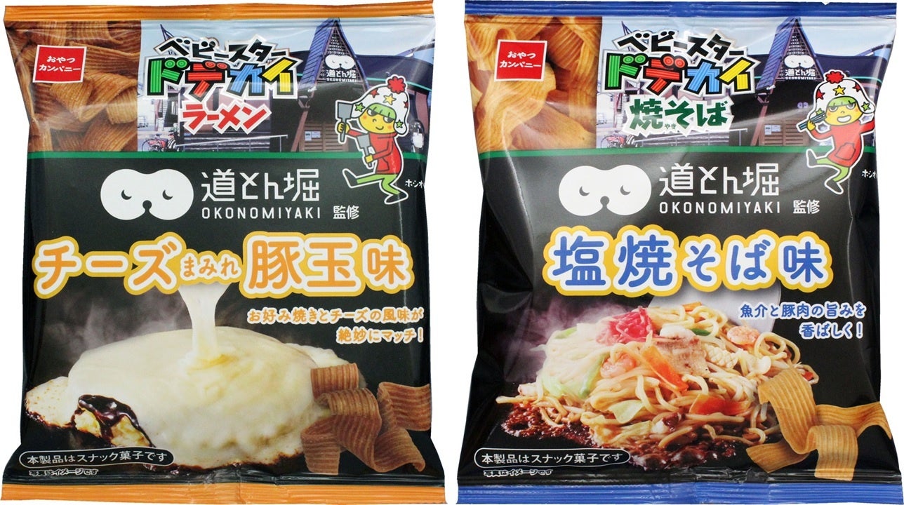 「ベビースタードデカイラーメン(お好み焼 道とん堀監修 チーズまみれ豚玉味)」は、豚肉と野菜の旨み、ソースの香り、濃厚なチーズの風味が絶妙にマッチした味わいに仕上げています。また、「ベビースタードデカイ焼そば(お好み焼 道とん堀監修 塩焼そば味)」は、えびなどの魚介と豚肉の旨みが広がる生地をまろやかでコク深い塩ダレ風味で仕上げました。