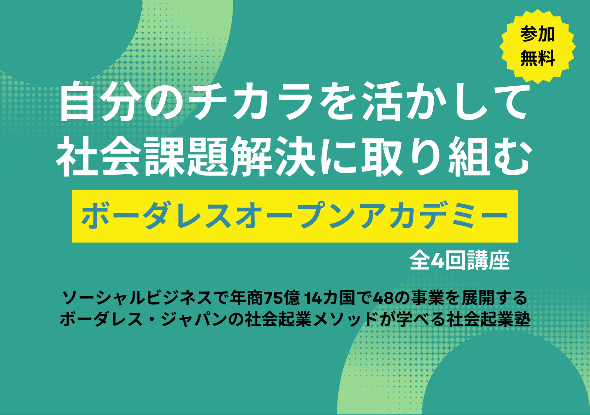 50以上のソーシャルビジネスを立ち上げてきたボーダレスグループの起業メソッドを学び、参加者の皆さん自身が関心のある、取り組みたい社会課題をビジネスで解決する方法をワークショップ形式で考えていきます。