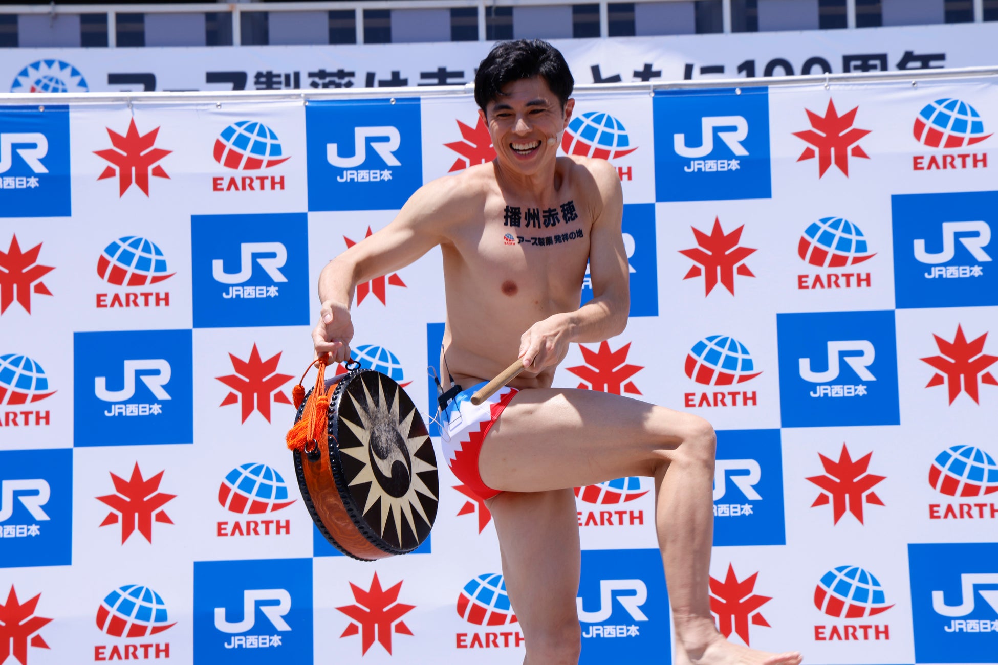 その後は、「子ども達、見ているんだよ!5,4,3,2,1」という掛け声を合図に、小島様の衣装が左右に破れるサプライズ演出も実施され、「100TH」と記されたパンツ姿で、胸元には「播州赤穂 アース製薬発祥の地」の文字が素肌に記された“新生・小島よしお”様が登場しました。続けて、「アース製薬100周年!」と叫びながら、全身を使って100周年への祝福を表現すると、観客の笑いと拍手を一身に集めました。