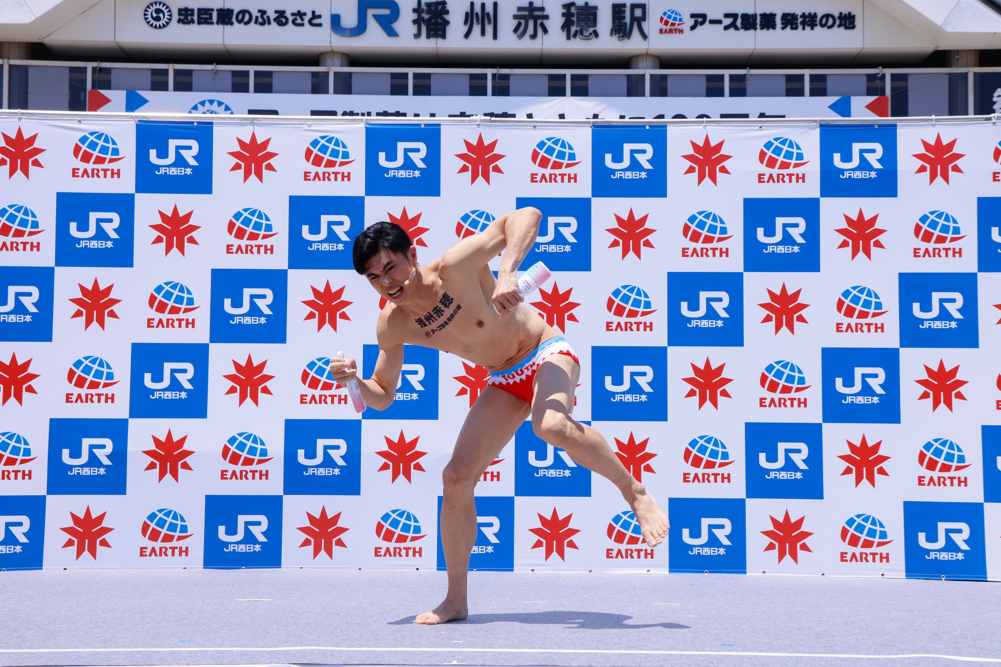 ■小島よしお様が登壇!「忠臣蔵のふるさと アース製薬発祥の地」を追加した駅名標をお披露目!駅名標とともに、小島様のスーツが左右に破れ「100TH」パンツ&素肌に“アース製薬発祥の地”がアンベール!100周年をダブルで祝福!