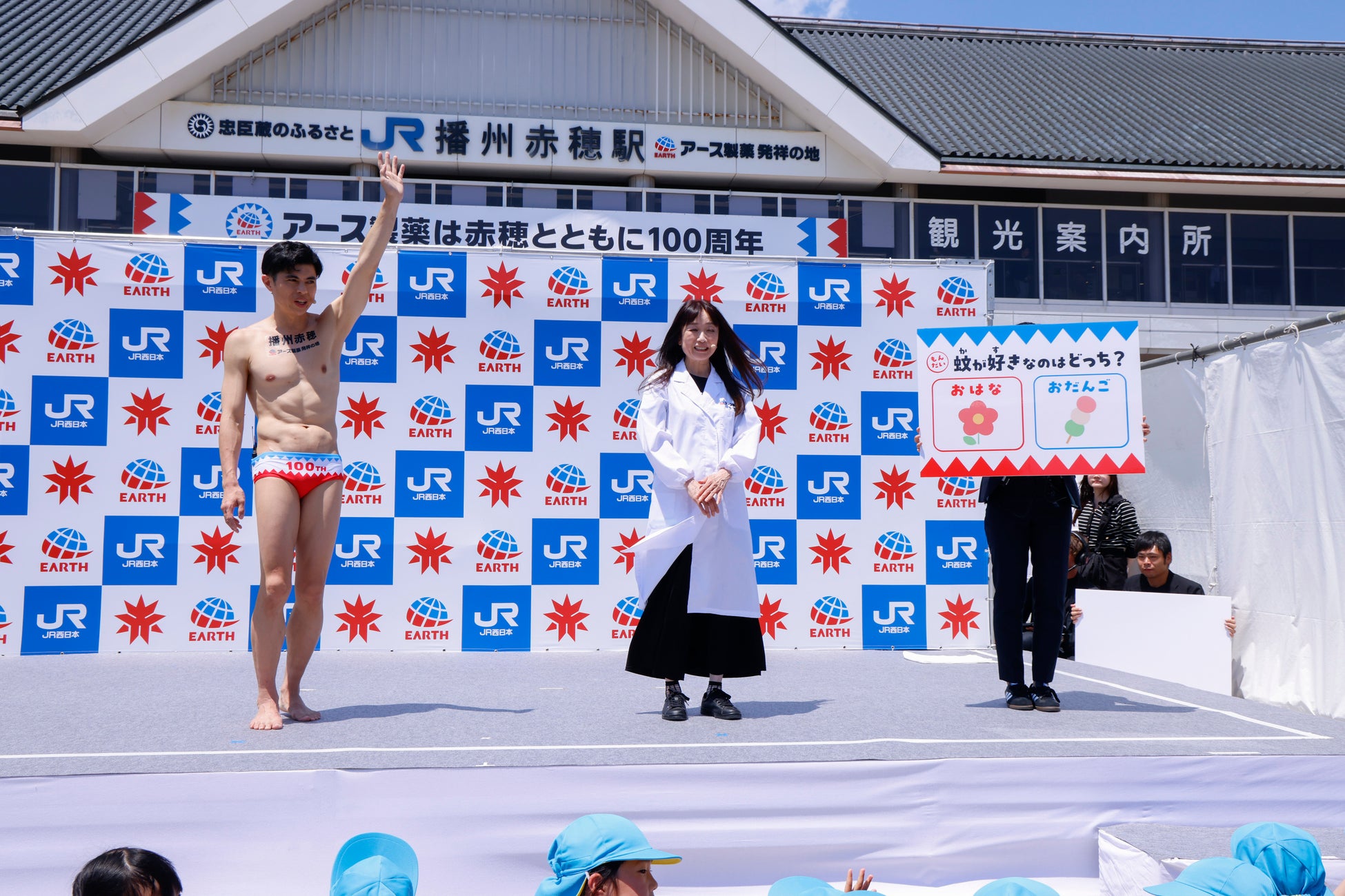 100周年を記念して、小島様とアース製薬がコラボした一日限りの特別パフォーマンス「そんなの関係ねえ!虫よけミストVer.」も披露されました。おなじみのリズムに乗せて小島様が「よしお裸だから刺されるところいっぱい、だけどもだけど、『はだまも』があれば、そんなの関係ねぇ!」と叫びながら虫よけミストを噴射するユニークな演出には、地元の赤穂幼稚園の子ども達も参加し、会場は笑いと熱気に包まれました。パフォーマンス後には、「以前、無人島ロケに裸の格好で行ったとき、家に帰ってきたら169か所も刺された思い出があり、ロケ先に、『はだまも』を持って行ければと思いました」と、虫よけの重要性と自身の経験を交えて振り返りました。