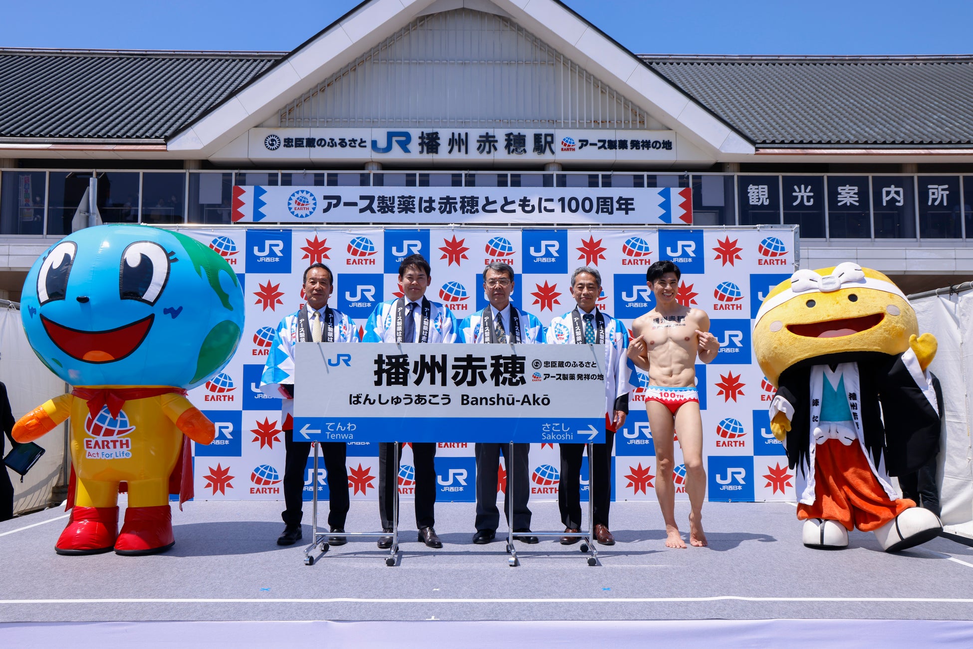 アース製薬株式会社(本社:東京都千代田区、代表取締役社長:川端克宜、以下「アース製薬」)は、2025年8月26日(火)に設立100周年を迎えることを記念し、「アース製薬は赤穂とともに100周年」をスローガンに掲げて、発祥の地*である兵庫県赤穂市でイベントを実施しました。また、6月4日(水)の「虫ケア用品の日」より、赤穂市及び西日本旅客鉄道株式会社(JR西日本)のご協力のもと、JR播州赤穂駅の駅名標に「忠臣蔵のふるさと アース製薬発祥の地」、JR坂越駅の駅名標に「北前船寄港地 アース製薬坂越工場前」をそれぞれ追加しました。