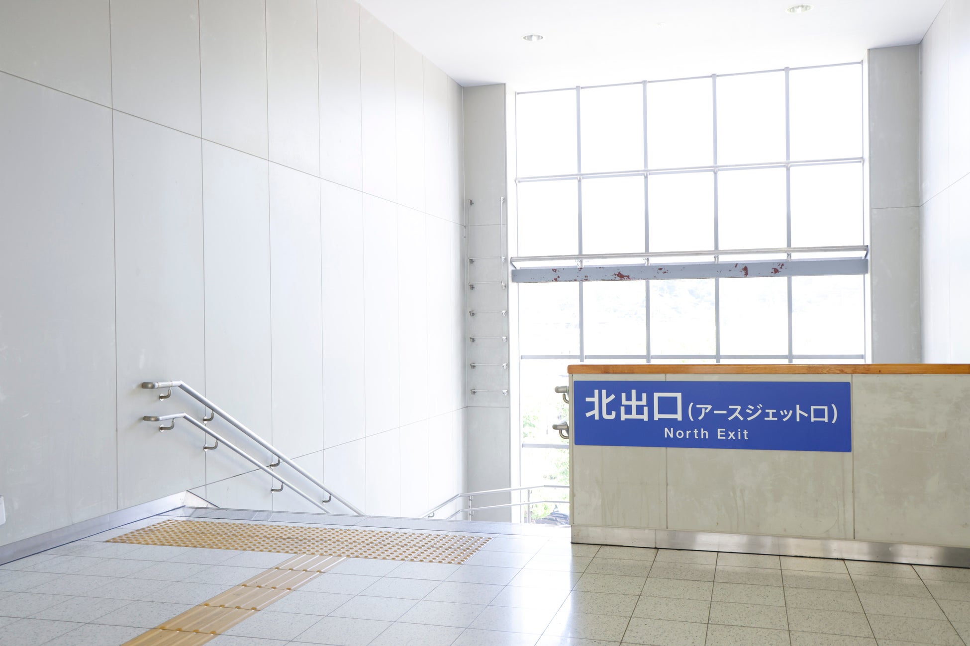 ・詳細:駅舎内の一部の出口案内板で、北出口を「北出口(アースジェット口)」、