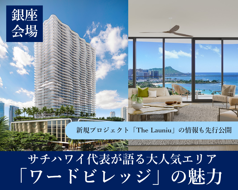 米国不動産投資は、資産分散の選択肢として、富裕層を中心に注目が集まっています。本セミナーでは、ハワイ・ホノルルのカカアコで人気の居住エリア「ワードビレッジ」や同エリアのコンドミニアムの新規物件を紹介します。当社のグループ会社、サチハワイ総合不動産会社(本社 ハワイ・ホノルル、以下「サチハワイ」)の代表取締役サチ・ブレーデン氏が、ハワイの不動産業界での長年の経験を踏まえて、ワードビレッジの特徴や米国不動産投資の魅力について、オープンハウス ハワイ代表、伊東嵩哉とともに、わかりやすく説明します。