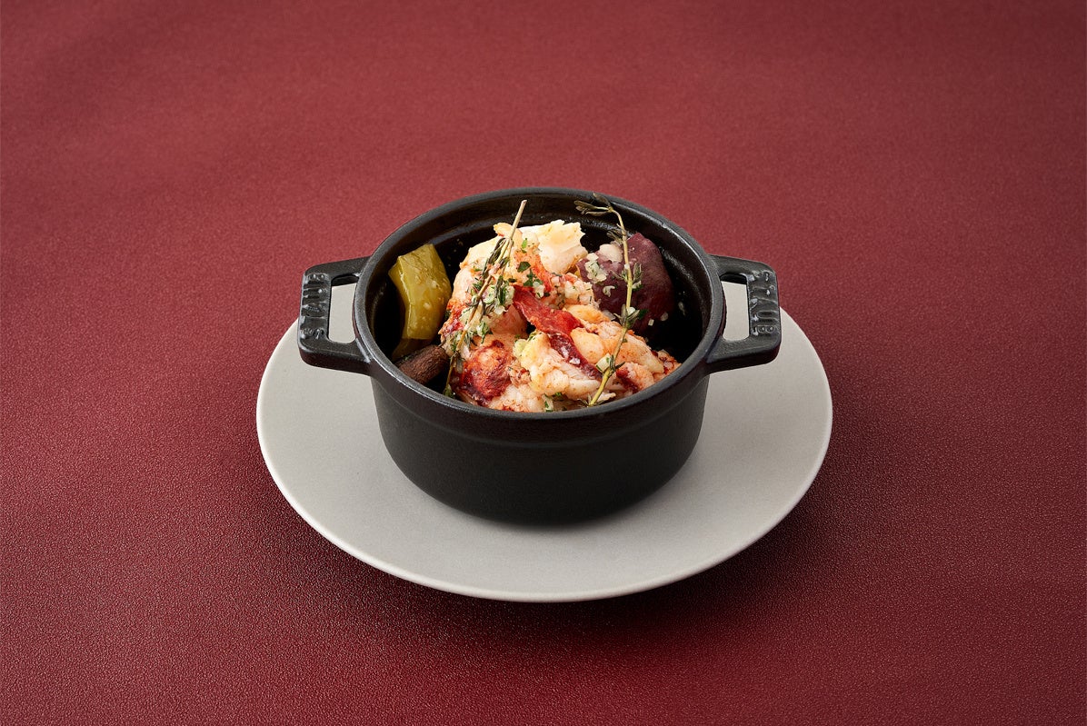 ○ オマール海老と地元旬野菜のオーブン焼き 瞬間燻製の演出