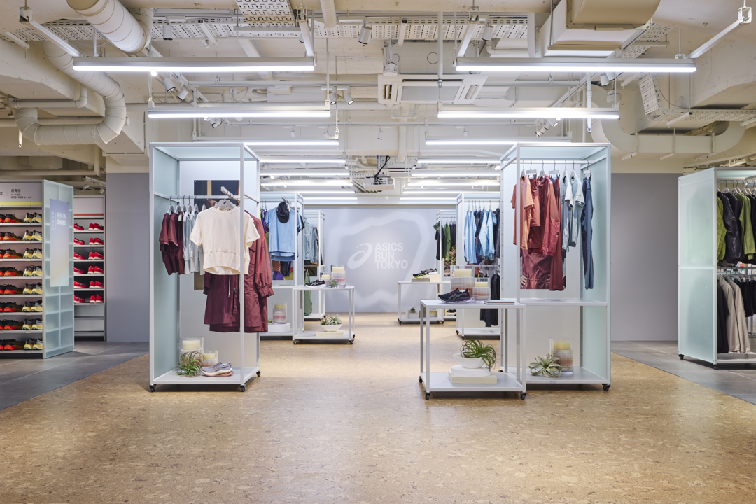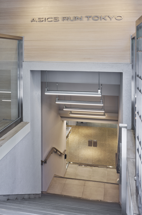 東京駅から徒歩3分の距離に位置する「ASICS RUN TOKYO MARUNOUCHI」は、ストア機能に加え、計測サービス、最新シューズやランニングデバイスのレンタル、アシックスランニングクラブコーチによるイベントなど、ランナーをサポートするために誕生した新形態の店舗です。時間に合わせて色が移り変わるライティングで「SKY(空)」を、サスティナブル素材であるコルクフローリングで「EARTH(大地)」を表現するなど、アシックスの新ブランドコンセプト「HORIZON」をデザインに落とし込んでいます。店内は従来のダークトーンからライトグレーの中性的カラーへ一新し、女性や初心者の方にとっても立ち寄りやすく、ランナーを明るく迎え入れる雰囲気を創出しています。