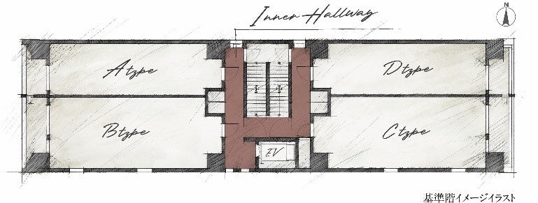 1フロアに4邸のみのレイアウトで全邸角住戸の開放感を実現。さらに各フロアはホテルライクな内廊下設計とし、外部からの視線を遮り風雨の影響も受けない安心の設計としました。