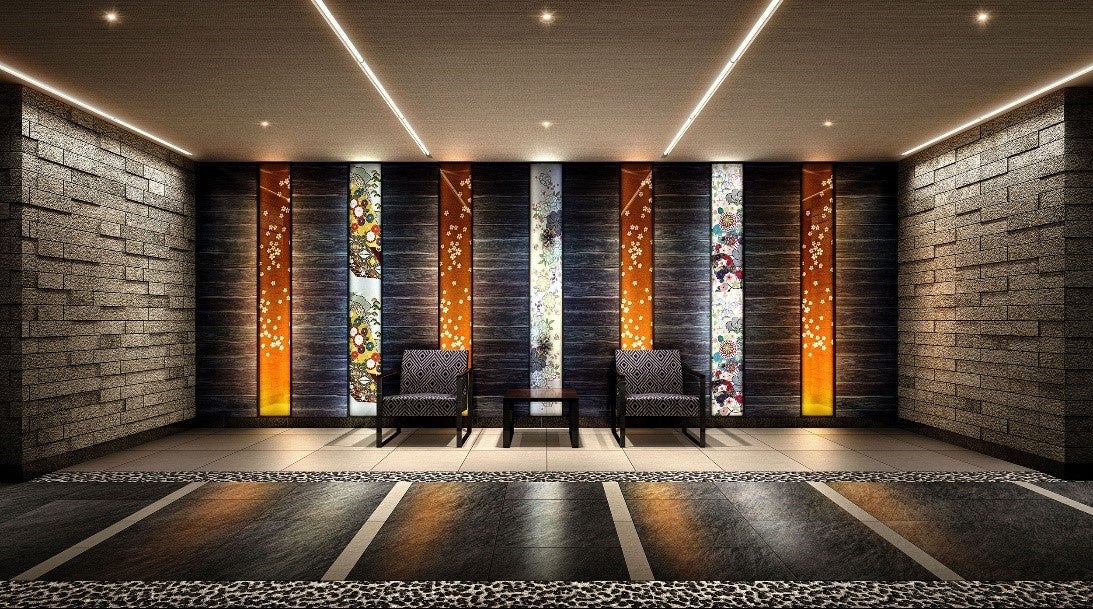 扉を一歩入り、エントランスホールで帰ってくる方を迎えるのは、伝統の織物を思わせる美しい和柄を装飾に仕立てたウォールアート。町家の記憶を感じる奥行きのあるアプローチや、格調高く洗練されたマテリアルのコンビネーションに「ネベル」シリーズならではの美意識が息づきます。
