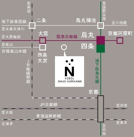 京都市営地下鉄烏丸線「四条」駅へ徒歩9分。「京都」駅へは直通2駅でアクセス可能。新幹線を利用すれば東へ西へ、遠方へのお出かけや出張もスムーズです。