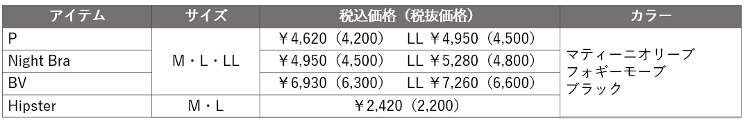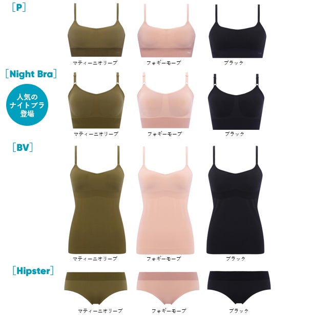 ラインアップは、4アイテムがエントリー。デイリーに活躍するノンワイヤートップやカップ付きキャミソール、ショーツはもちろん、睡眠意識の高まりで人気のナイトブラもご用意しました。取り外し可能なパッド入り、ストラップの長さ調節のためのアジャスターは前側に付け、就寝時に背中にあたる不快感に配慮しました。