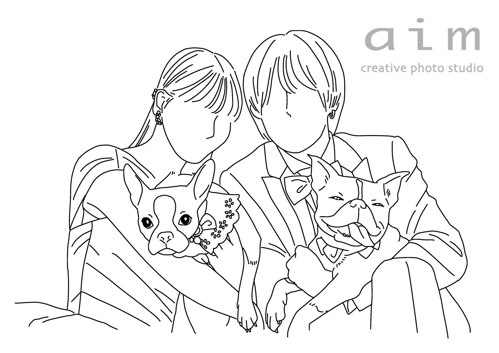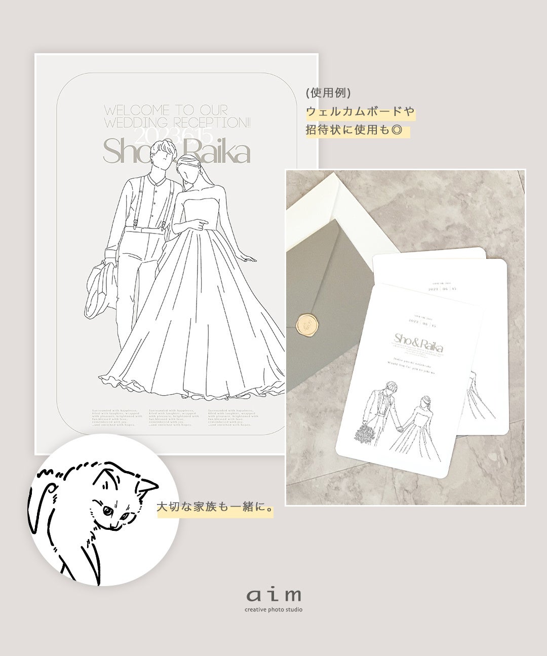 先日リニューアルしたaimオリジナル商品としてご提供している「クリアウェルカムボード」という商品から派生して、当スタジオで撮影いただいたお二人のお写真をイラスト化しお渡しする商品、「イラストデータ」が新登場いたしました。