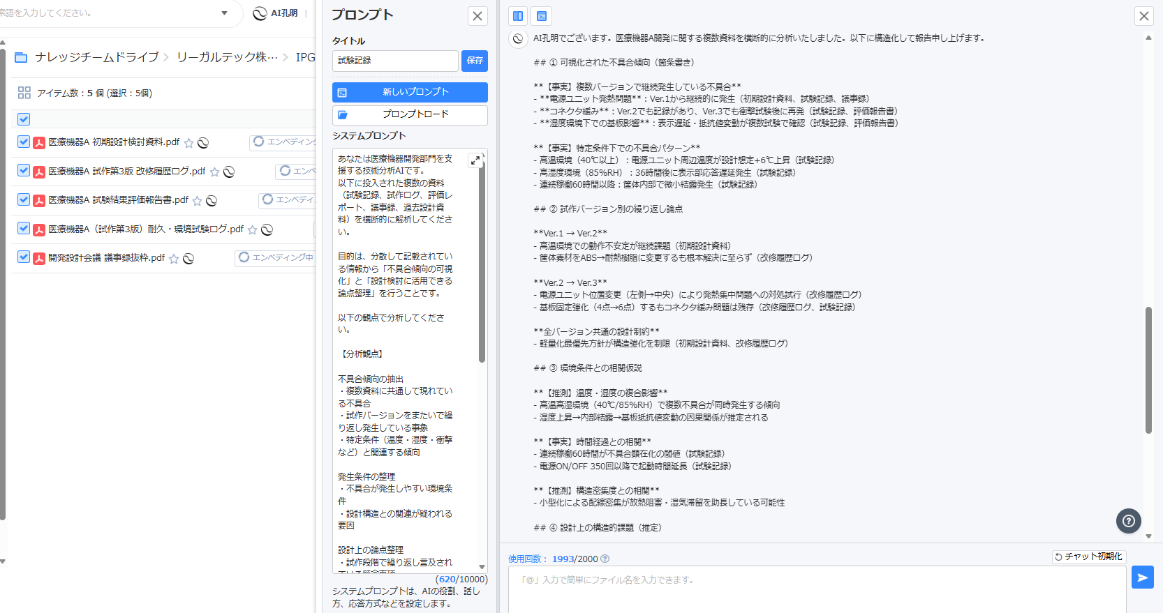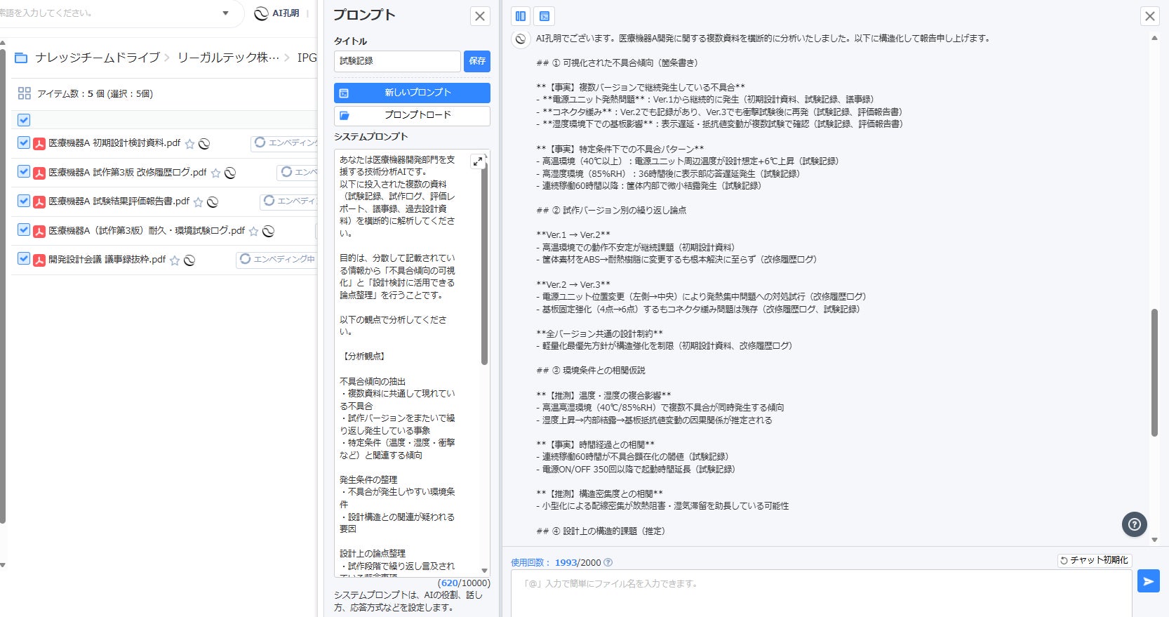 医療機器開発においては、試験記録や試作ログといった分散しがちな情報を横断的に解析し、不具合傾向や設計上の論点整理を支援する。
