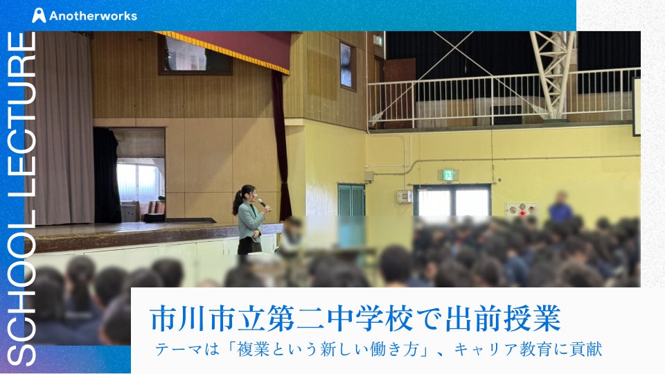 複業したい個人と企業や自治体を繋ぐ、総合型複業マッチングプラットフォーム「複業クラウド」を運営する株式会社Another works(本社:東京都港区、代表取締役:大林 尚朝、以下「Another works」)は、市川市立第二中学校(所在地:千葉県市川市)にて、中学1年生230名に対し、複業という新しい働き方をテーマに出前授業を実施いたしました。講師として、Another works の社長室 黒田瑛子が登壇いたしました。