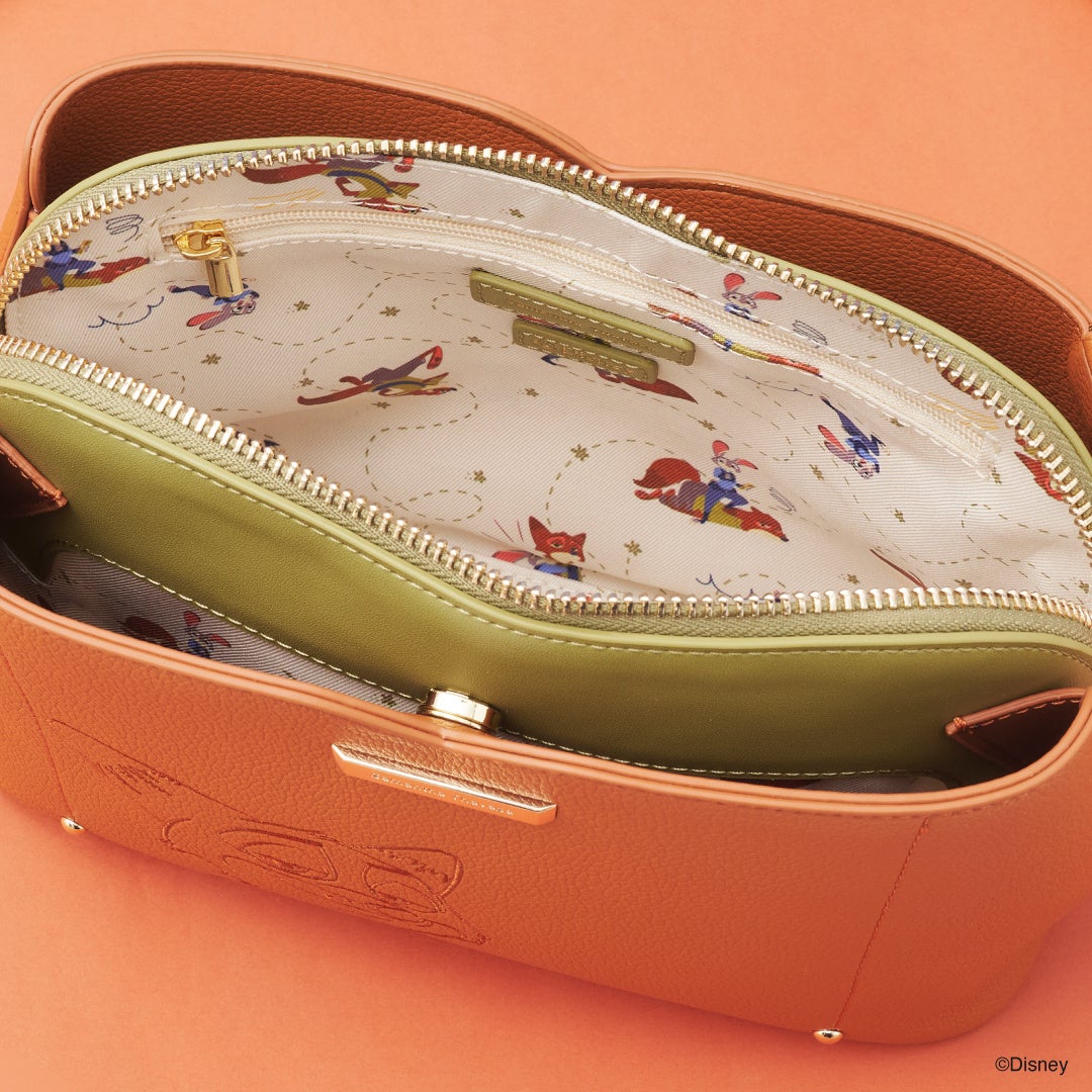 バッグ本体とは異なる、チラッと見える内側のカラーは、「ジュディ」と「ニック」が着用しているお洋服をイメージしています。裏地には、「ジュディ」と「ニック」の様々な愛らしい様子をデザイン。それぞれの異なる表情にもご注目ください。