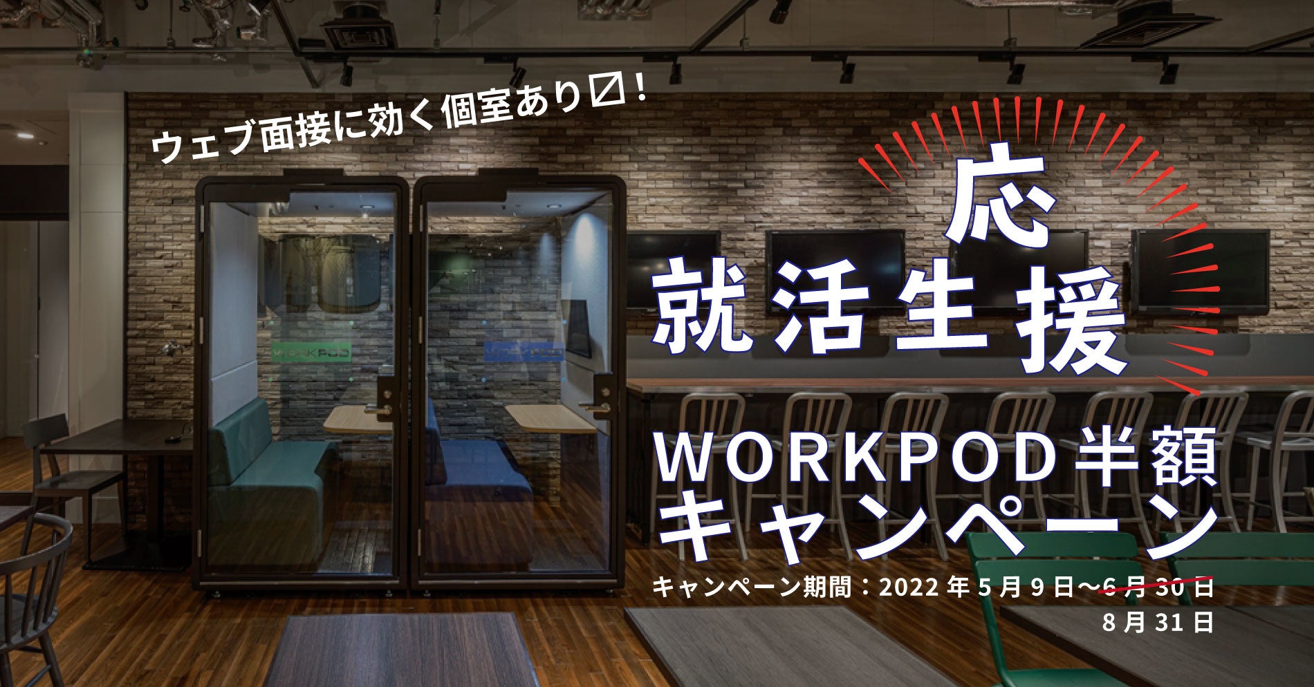 本キャンペーンは、就活生を対象に、施設内に常設している【WORKPOD】を通常価格の半額でご提供するものです。受付時に学生証をご提示いただくだけで、キャンペーンをご利用いただけます。