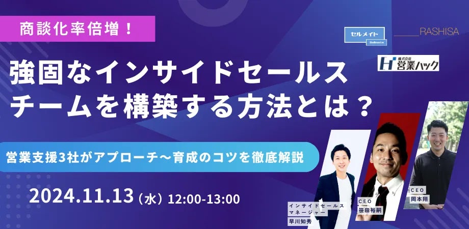 今回のセミナーでは、チームでインサイドセールスの成果を向上させるためのアプローチ〜メンバー育成について、営業支援のプロ3社がディスカッション形式で解説。営業支援を行う、『営業ハック』『RASHISA』『セルメイト』が蓄積したノウハウです。この機会に是非ご参加ください。