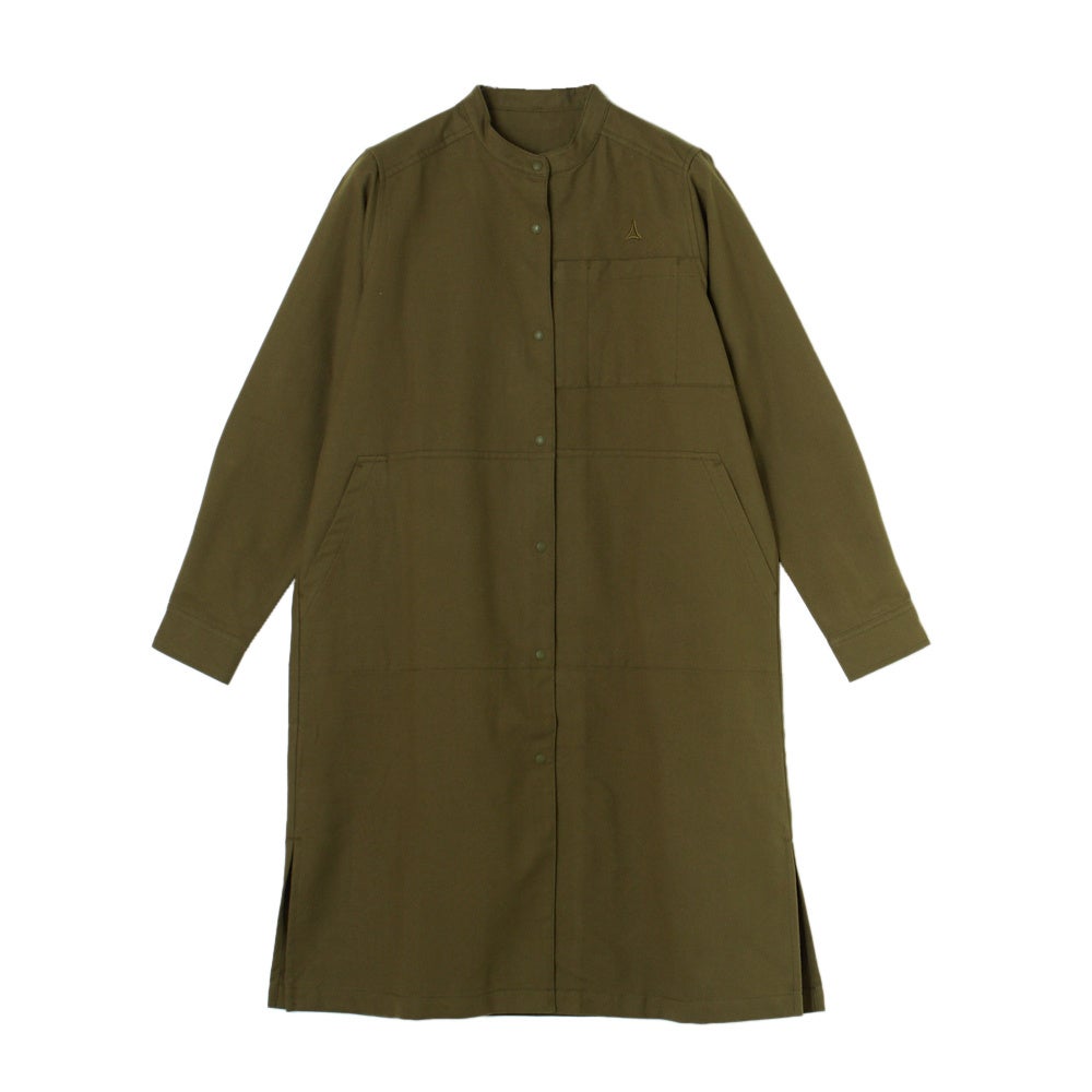 軽量で保温性が高くストレッチ性にも優れたサーモライト®を使用した大人気のスタンドカラーのシャツワンピース。化学繊維ながら良質なウールフランネルのような風合いを持ち、着やすいのが特徴です。左胸には少し深めのスナップボタンがついたポケットが付き、両脇には大きめのポケットがついてます。チェック3柄とソリッド2色の5色展開です。