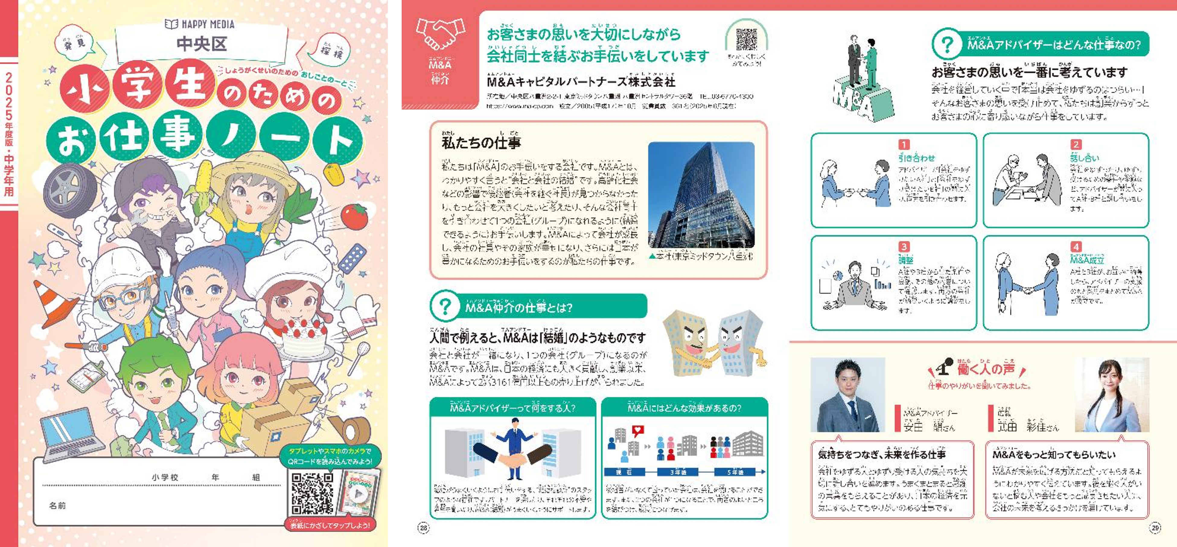 M&Aキャピタルパートナーズ株式会社(以下、「MACP」。東京都中央区・代表取締役社長 中村 悟) は、2025年10月に発行された文部科学省が推進するキャリア教育における副読本「発見 探検 中央区 小学生のためのお仕事ノート」2025年版を2023年度版、2024年度版につづき3年連続で協賛したことをお知らせします。誌面では、2ページにわたりMACPが掲載され、M&Aとその役割、社会的意義、M&Aアドバイザーの仕事内容などが小学生向けに分かりやすく解説されています。