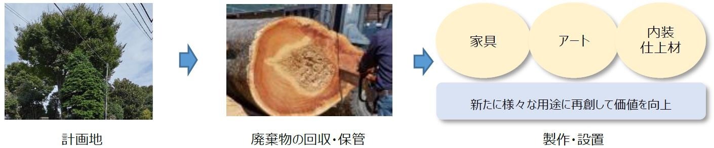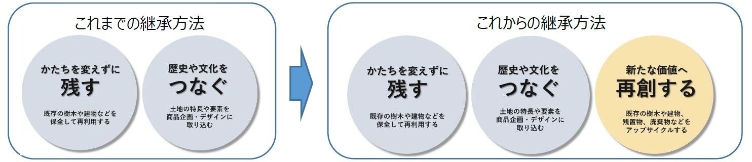 当社では長年にわたり商品企画における軸の一つとして、計画地内の既存の樹木や建物の一部等を保全し再利用することや、計画地周辺に所縁のある象徴性の高い物品等を残し、新築計画に取り入れることで、土地の記憶を継承することに取り組んでまいりました。今般、環境負荷の低減にも配慮したアップサイクルの発想も取り入れ、新たなすまいの付加価値創出を目指す本取り組みを、今後分譲する新築物件で順次展開いたします。