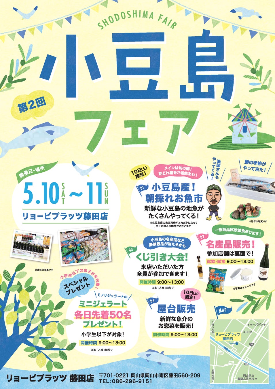 その一環として、昨年初めて開催し大変好評をいただいた「小豆島フェア」を、2025年5月10日(土)・11日(日)にリョービプラッツ藤田店(所在地:岡山県岡山市南区藤田560-209|運営:両備ホールディングス株式会社両備ストアカンパニー<https://ryobi-store.jp/>)で開催しますのでお知らせします。