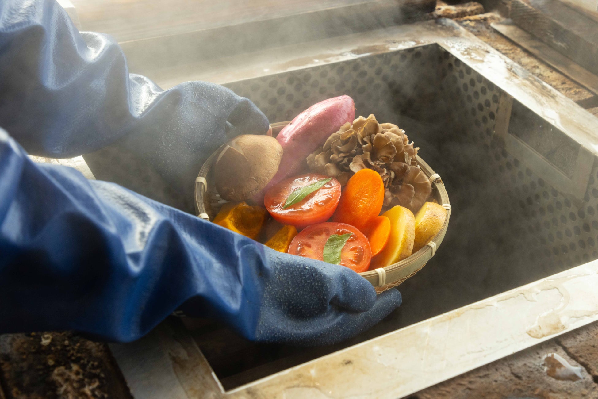 グランシア別府鉄輪では、自家源泉の高温の噴気により素材を蒸し上げる別府名物地獄蒸し体験をお楽しみいただけます。