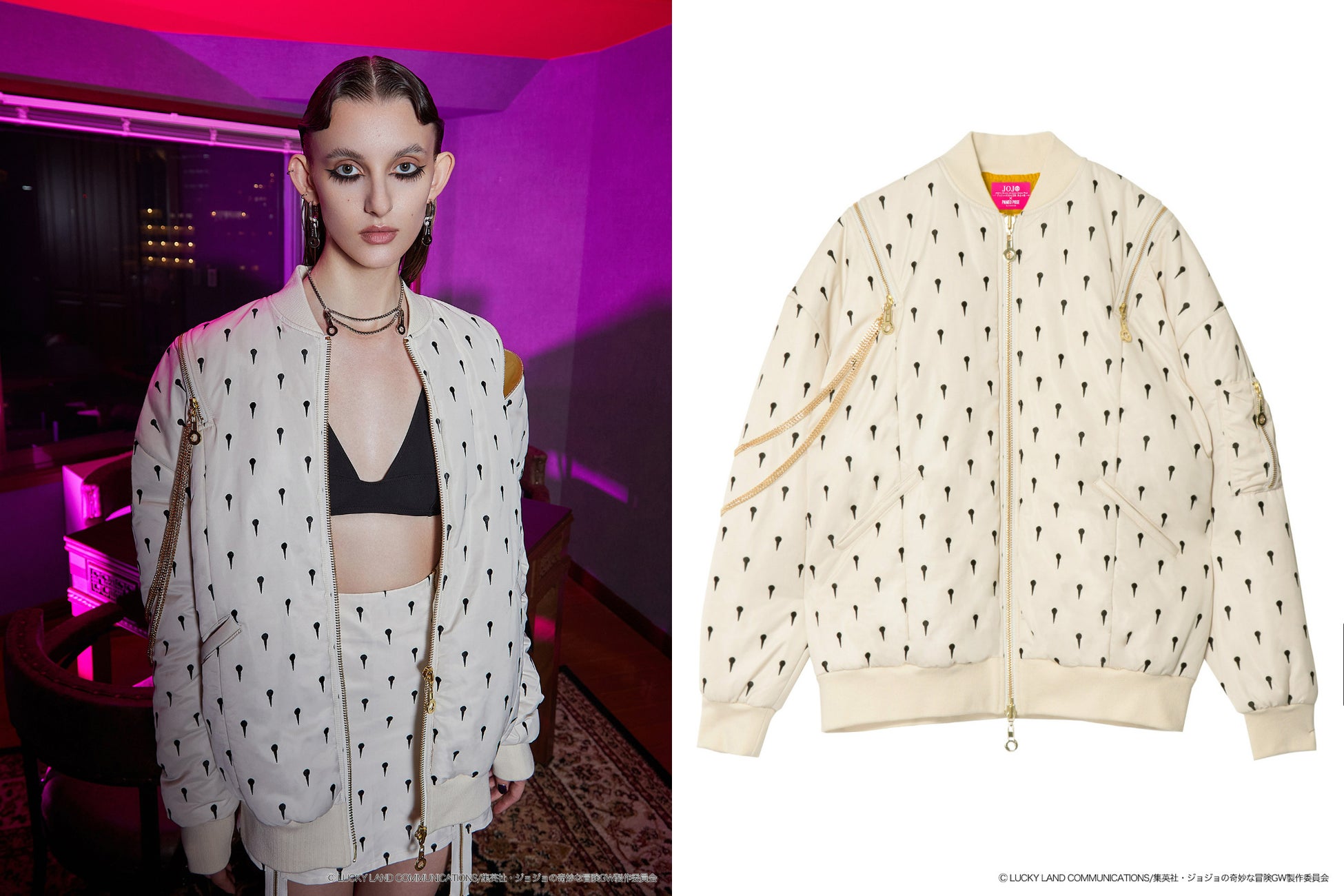 気品漂うブチャラティ柄刺繍のナイロン生地と、存在感のあるゴールドのスライダーがきらめくブローノ・ブチャラティのMA-1。