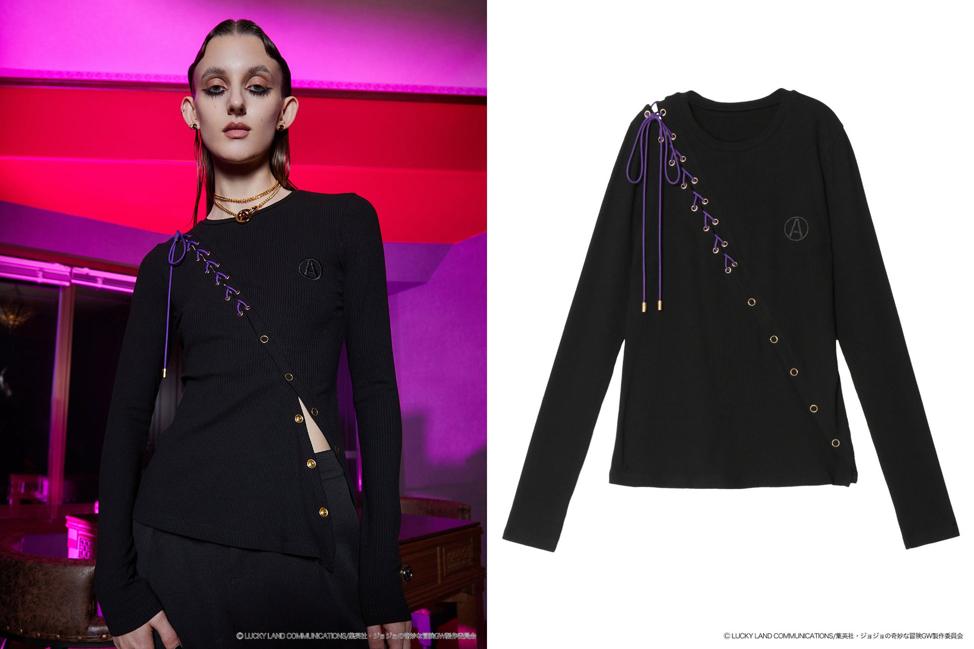 パープルのレースアップと、胸元のAマークの刺繍でレオーネ・アバッキオを表現しました。