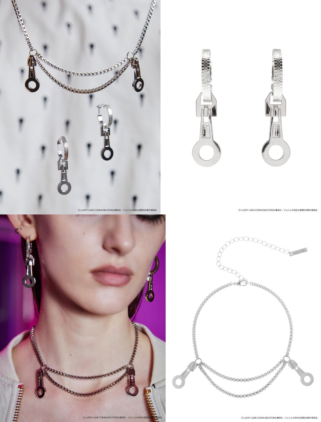 エレメント(ジップ)のホールは、自由自在にジッパーを操れる彼のスタンド能力を表現しました。存在感のあるスライダーは、歩く度にきらきらと揺らめきます。