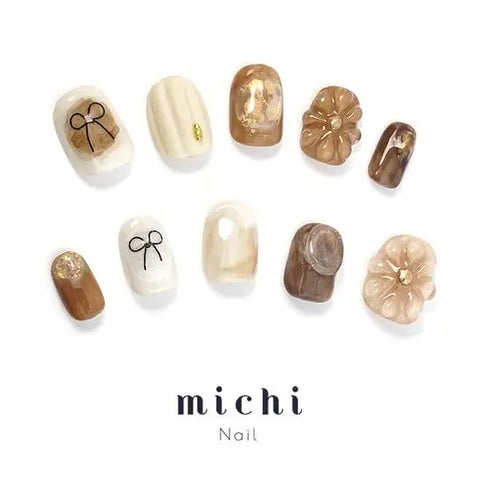 春のブラウンネイルはこちらがおすすめです。ぷっくりフラワーにワイヤーリボンでかわいらしさが詰まったデザイン。イエローやブラウン系のファッションと合わせたいネイルチップです。