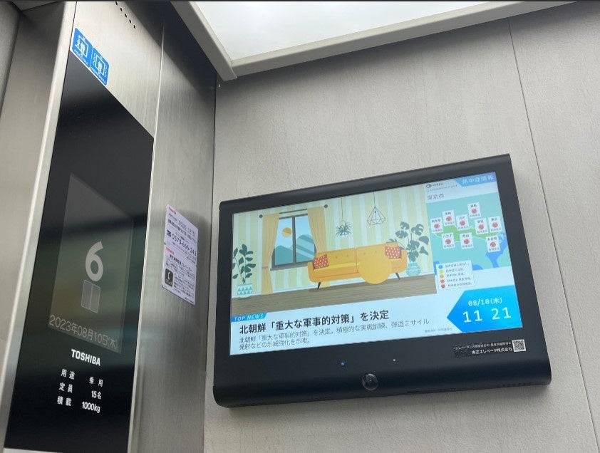 DNPは、東芝エレベータ株式会社および株式会社日立ビルシステムと業務提携し、全国のマンションやオフィスビルのエレベーター内に2,200面以上のデジタルサイネージを設置し、日々の生活に有益な情報や広告等を表示しています。