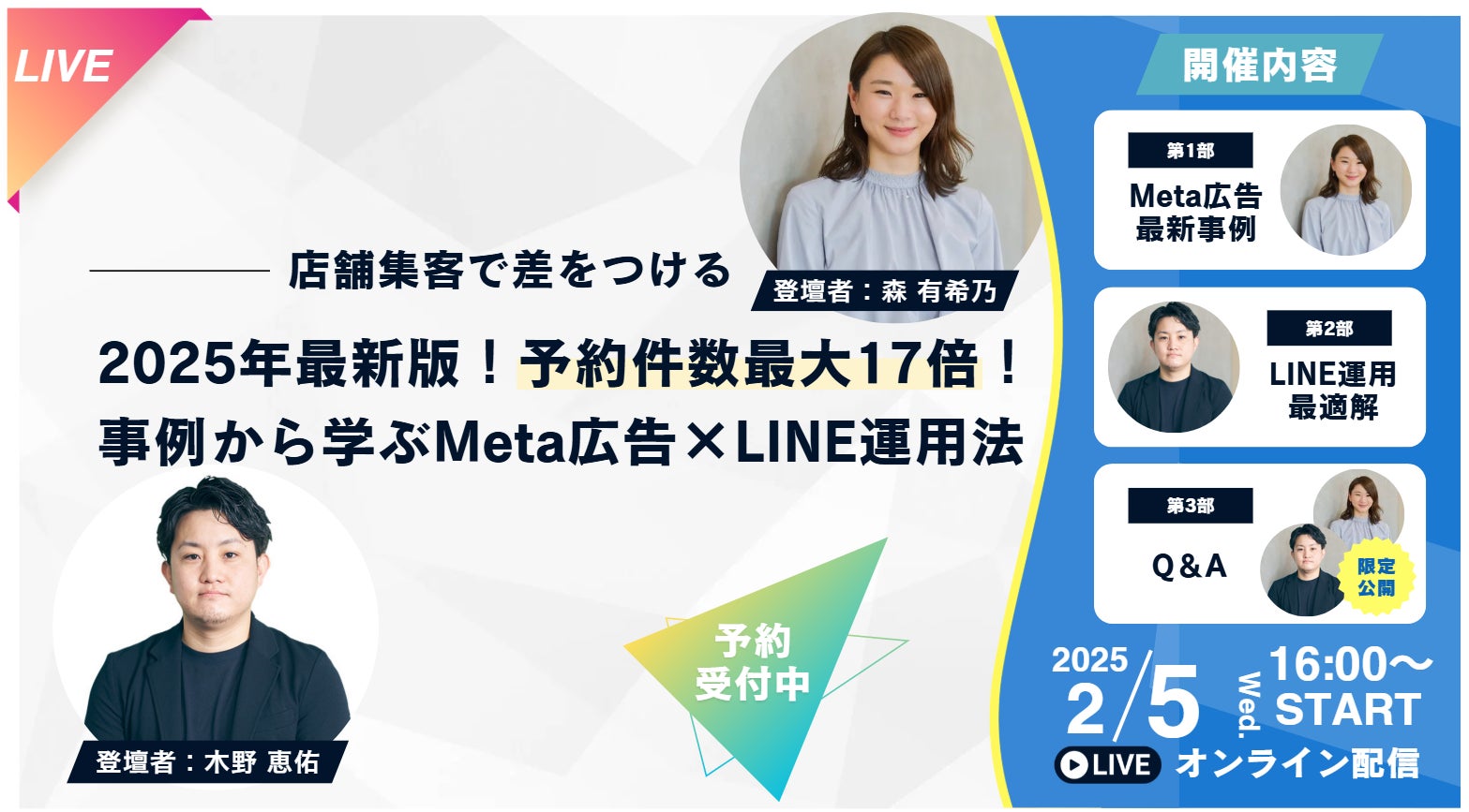 『【店舗集客で差をつける】2025年最新版!予約件数最大17倍!事例から学ぶMeta広告×LINE運用法』ウェビナー開催〈無料〉