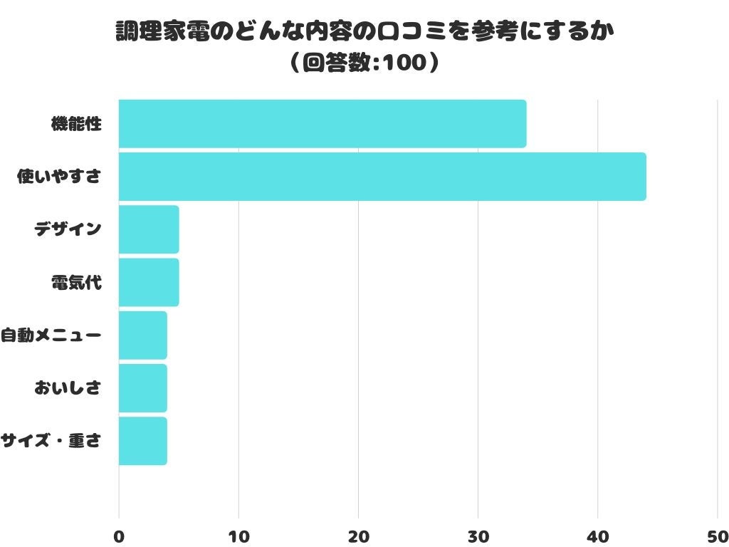 調理家電のどんな内容の口コミを参考にするかをアンケートにて調査したところ、1位は「使いやすさ」 でした。
