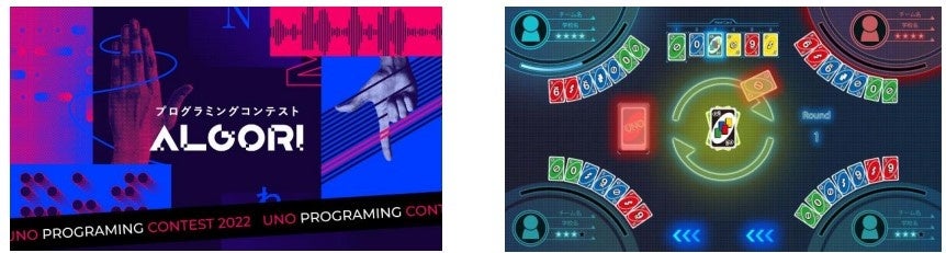 本コンテストでは2度の予選大会を実施し、勝ち進んだ上位8チームが決勝大会に進出。決勝大会では視聴者がオンライン配信で観覧できるよう、プログラム同士の対戦を本来のUNO™の対戦のように可視化したUI画面を用意しています。