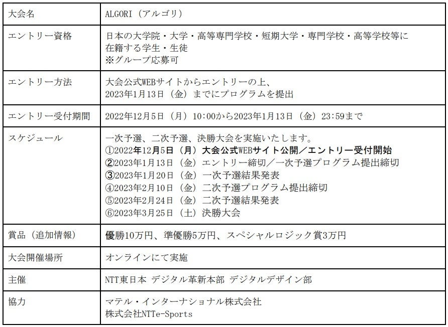 NTT東日本主催の学生プログラミングコンテスト「ALGORI」正式エントリーの受付を開始 ~NTT東日本のエンジニアが開発をサポート「プログラム開発相談窓口」開設~