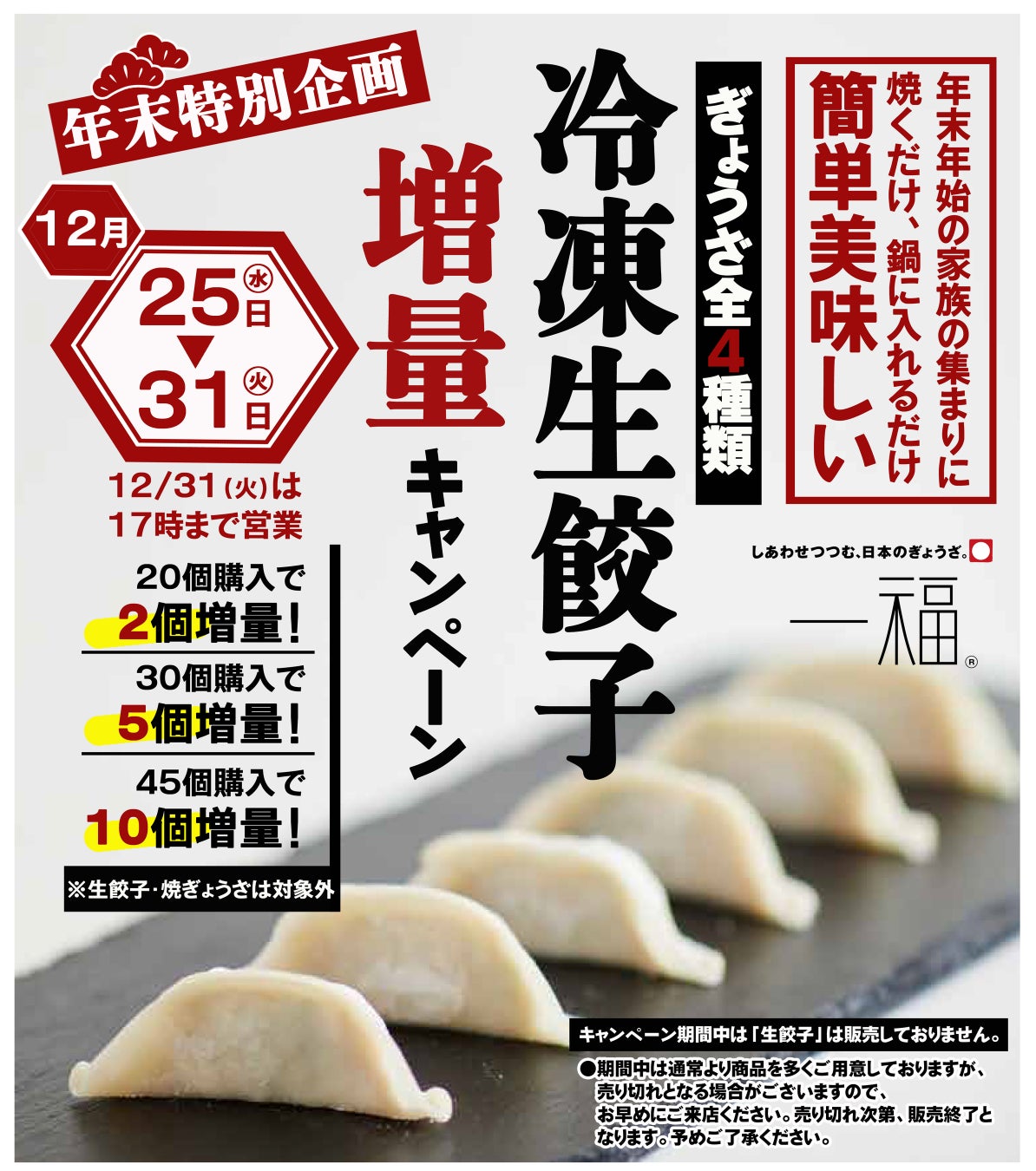 【一福】JR塚口店限定の年末特別企画「冷凍生餃子増量キャンペーン」実施!