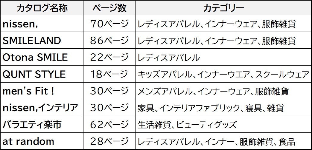 株式会社ニッセン(本社:京都市南区、代表取締役社長:羽渕淳)は、新作商品を掲載した最新カタログ7誌を、5月11日(水)に発行しました。掲載商品は、ニッセンオンラインショップ(https://www.nissen.co.jp/)で購入が可能です。