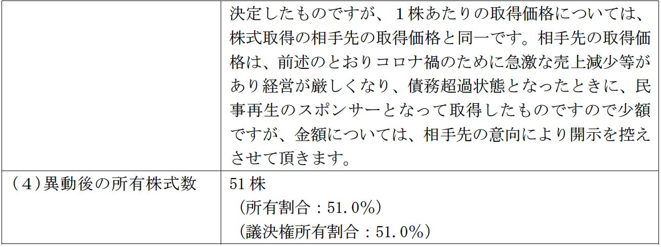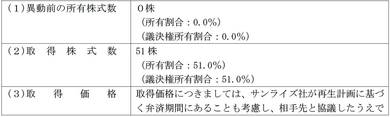 当社は、サンライズの財務状況を慎重に検討した結果、2023年10月期は営業損益が黒字に転換 し、事業を整理し再生計画に則った再建過程で売上規模は一旦縮小するものの、今後も黒字を継続する経営改善が見込める状況になったと判断し、同社の51%を取得することといたしました。また、エバーオンワードはサンライズの再生計画にスポンサーの立場から関与しており、与信上の問題を解決するためサンライズの重要な仕入れ先になった経緯もあるため、引き続き同社の49%を保有することになりました。