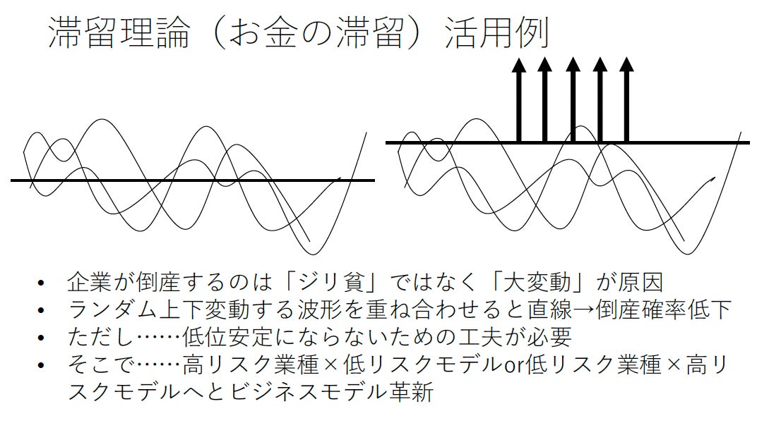 これまでの大多数の日本企業は高リスク市場に高リスクビジネスモデルを充て(例:飲食店経営をおこなう際に先に店舗に巨額投資をおこなう等)、低リスク市場に低リスクビジネスモデルを充てることで(例:大手の下請けを請負契約でおこなう等)資金大変動と資金滞留⇒倒産という道 か、変動が少ないジリ貧の道かのどちらかを進んでおりました。