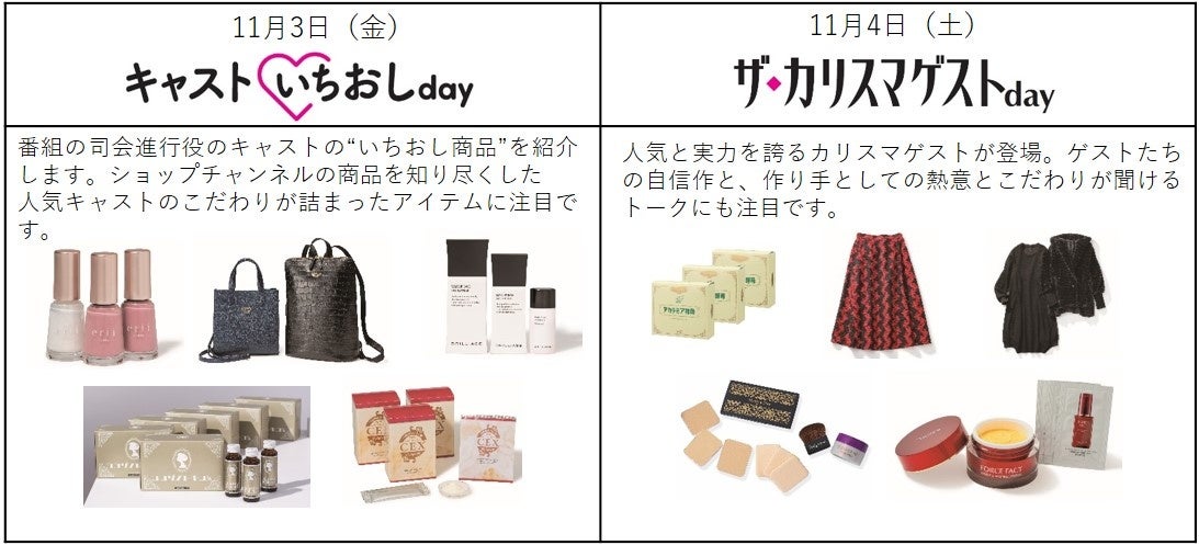 「キャストいちおしデイ」、11月4日は「ザ・カリスマゲストデイ」を放送し、選りすぐりの商品が多数登場します。