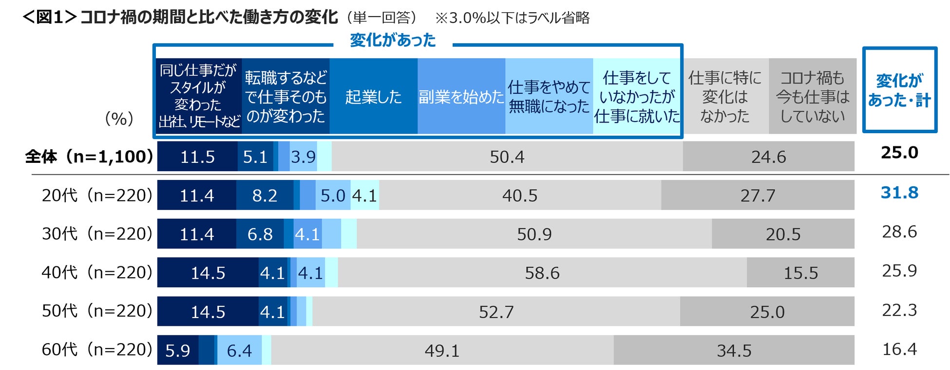4人に1人がコロナ禍期間と比べて「働き方に変化があった」と回答。20代は約3人に1人と多い。<図1>