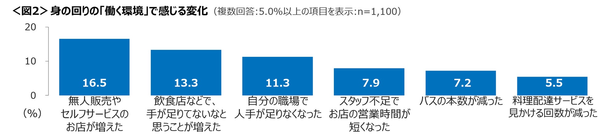 身の回りの「働く環境」で感じる変化としては、「無人販売やセルフサービスのお店が増えた」がトップ。<図2>