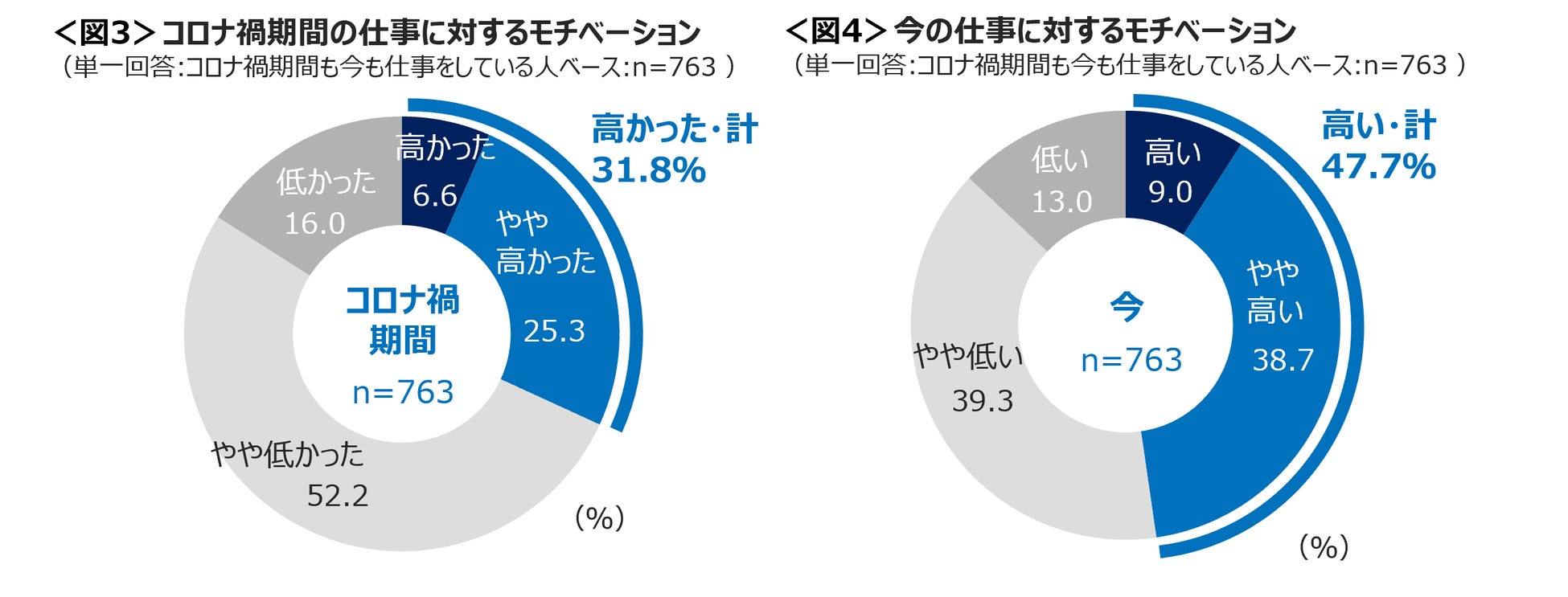 コロナ禍期間に仕事のモチベーションが高かった人は31.8%。現在の仕事のモチベーションが高い人は47.7%と半数近い。<図3・4>