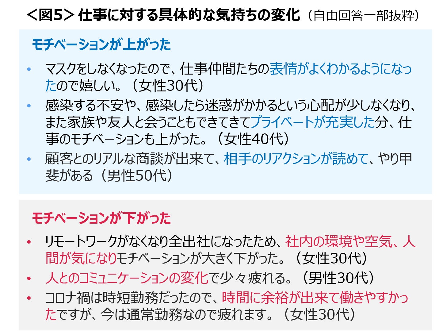 コロナ禍と比べて仕事のモチベーションが上がった理由としては「マスクを外したことで表情がわかるようになった」「プライベートが充実した」などが、モチベーションが下がった理由としては「コミュニケーションの変化」「出社が増えて時間に余裕がなくなった」などが影響していると考えられる。<図5>