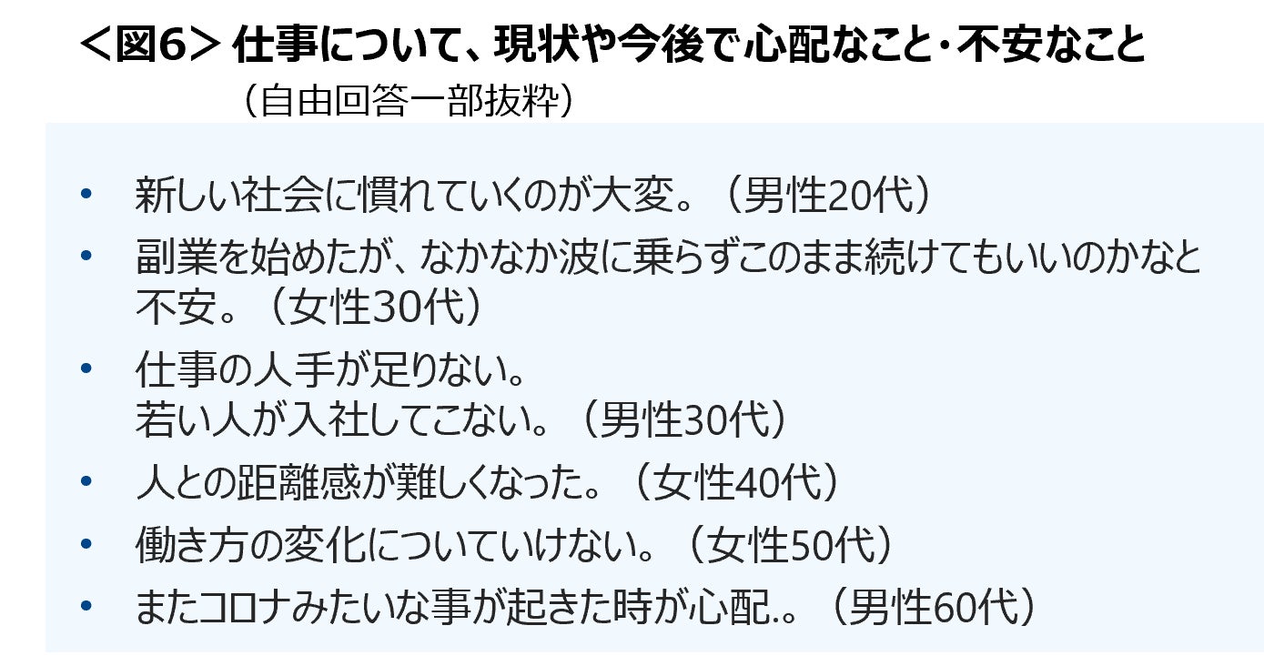 仕事に対する不安ごとでは「働き方の変化についていけない」、「人との距離感が難しくなった」などの社会の変化に対するものや、「労働時間の増加」、「人手不足」など労働環境に関する不安の声があがった。<図6>
