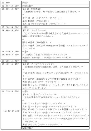今回は、「Chat GPTの登場、AIの進化でGAFAMはどうなる?」というテーマで、メディアアーティストの落合陽一氏とIT批評家の尾原和啓氏、そして松本大による特別鼎談を行います。また、元日銀審議委員を含む多数の専門家を招き、10年ぶりの日銀総裁の交替に伴う日本株、円相場、日本経済への影響を語っていただくプログラムや、マネックス証券が誇る講師陣の講演・パネルディスカッションなど、大きな変化が予想される今後のマーケットでの投資戦略のヒントをお届けいたします。話題の新NISA制度を解説するトークショーの他、紅白出場の有名歌手の特別ライブセッションを行うなど、お客様に長く、楽しく、投資を続けていただくための一助となるコーナーもご用意しております。