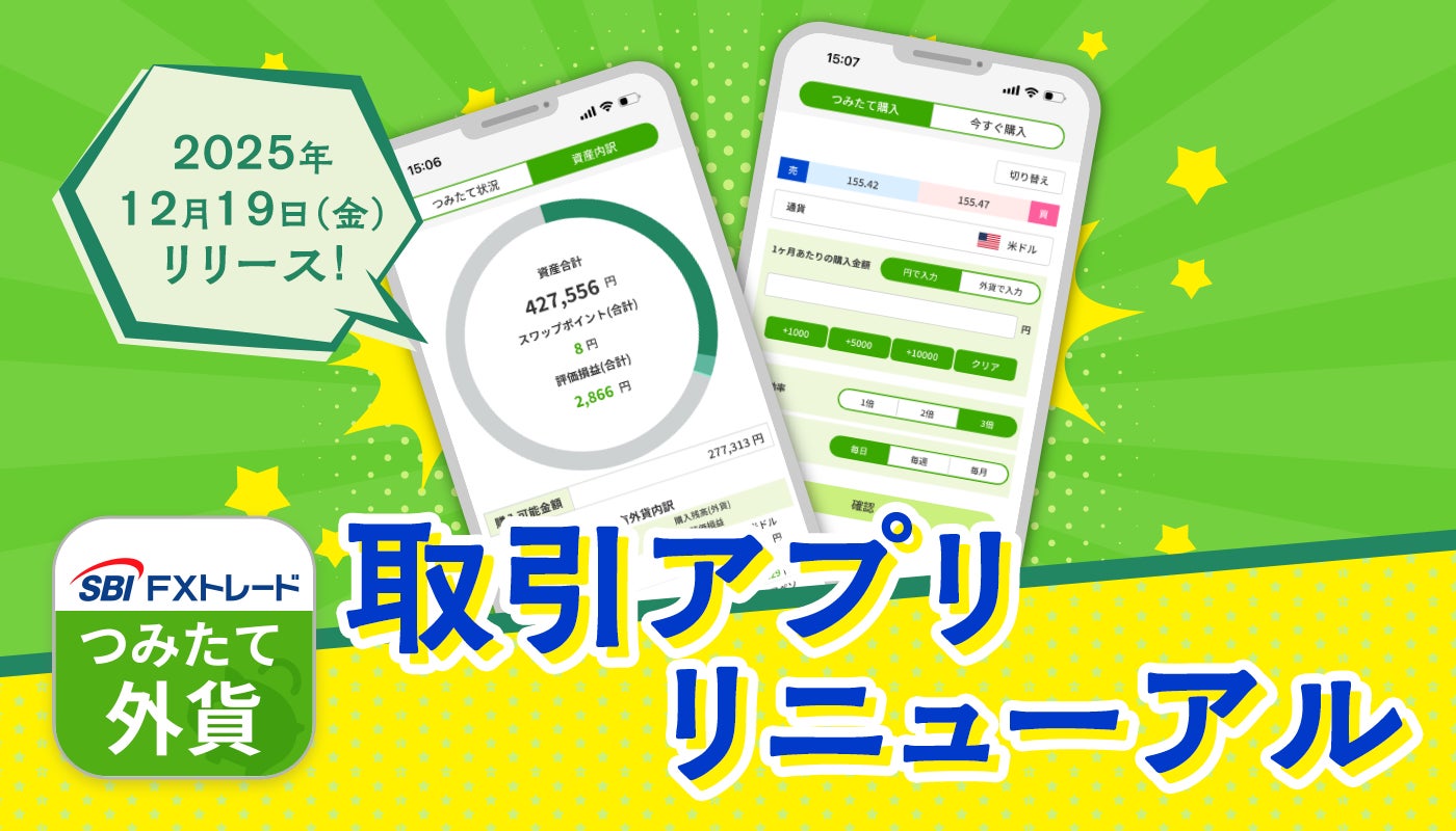 SBIホールディングス株式会社(本社:東京都港区、代表取締役会長兼社長:北尾 吉孝)の連結子会社で、個人投資家向けに外国為替取引サービスを提供するSBI FXトレード株式会社(本社:東京都港区、代表取締役社長:藤田 行生)は、スマートフォン版外貨取引アプリ『つみたて外貨』を2025年12月19日(金)にリニューアルいたしました。