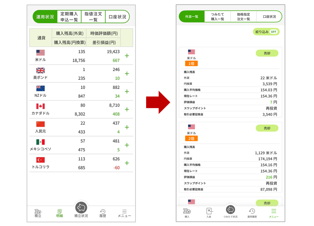 「運用状況」という名称を「外貨一覧」に変更し、画面を開いた際に通貨ごとの購入残高・評価損益・投資効率などをまとめて確認できるようにいたしました。