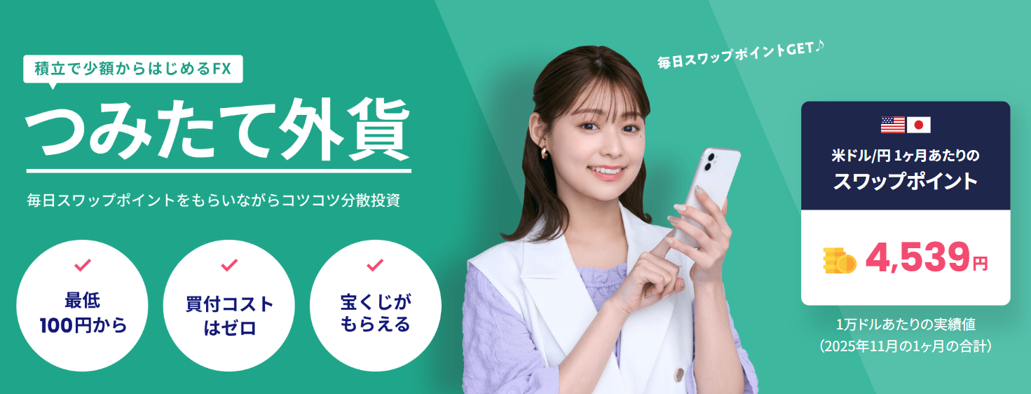 つみたて外貨は、「FXの仕組み」を活用して外貨を積み立てるサービスです。100円からコツコツと積み立てられるため、初心者の方でも取り組みやすく、中長期的な資産運用をご提案できるサービスとなっております。