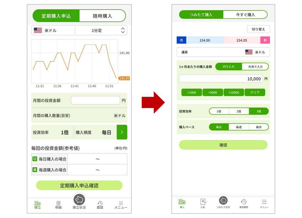 また、購入方法も「定期購入」→「つみたて購入」、「随時購入」→「今すぐ購入」とし、初めての方でも迷わず操作できるよう改善いたしました。