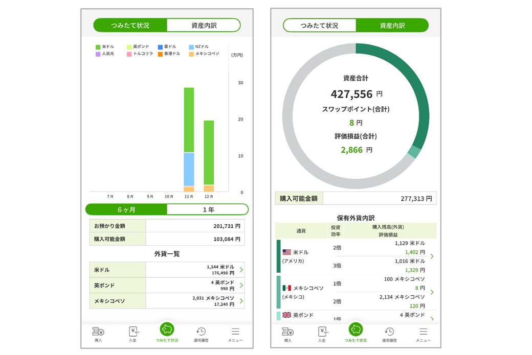 また、WEB版でのみ提供していた『資産内訳』をアプリにも追加し、保有外貨の構成を円グラフで確認できるほか、投資効率ごとの数量や評価損益も一目で把握できます。